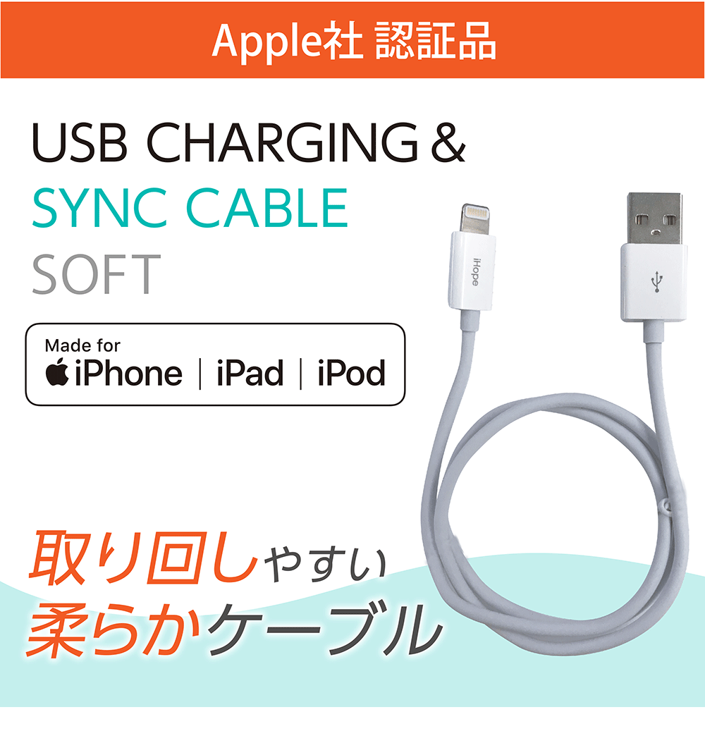 [商品仕様] iPhone 通信 充電ケーブル やわらかケーブル MFI認証品 ライトニング ケーブル ●出力5V 最大2.4A (iPad まで充電可能) ●コネクタLightning USB 2.0 Std-A ●コード長150cm、200cm ●重量[150cm]約36g、[200cm]約46g 【適合確認済機種】 (iPhone):iPhone 13 Pro Max、iPhone 13 Pro、iPhone 13 mini、iPhone 13、iPhone12 Pro Max、iPhone12 mini、iPhone12 Pro、iPhone12、iPhoneSE 2、iPhone11 Pro Max、iPhone11 Pro、iPhone11、iPhoneXR、iPhoneXS Max、iPhoneXS、iPhoneX、iPhone8、iPhone8 Plus、iPhone7、iPhone7 Plus、 iPhoneSE、iPhone6s、iPhone6s Plus、iPhone6、iPhone6 Plus、iPhone5S、iPhone5C、iPhone5 (iPad):iPad8、iPad7、iPad6、iPad Pro10.5、iPad Pro12.9第2世代、iPad5、iPad pro 9.7インチ、iPad Air 3、iPad Air 2、iPad mini 5、iPad mini 4、iPad mini 3 ※ iPadはパソコンからは充電できません。