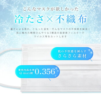 暑い夏を乗り越える必需品! 三層構造の使い捨て不織布マスク「冷感不織布マスク」 不織布使い捨てマスクに接触冷感加工を施した夏の新型マスクです。