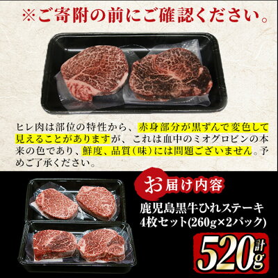 【ふるさと納税】【数量限定】和牛日本一!<鹿児島黒牛>ヒレステーキ4枚セット 計520g(260g×2パック)きめ細やかな肉質とバランスの良い霜降り国産牛肉の中でもヒレは脂肪分が少なく、きめが細かい柔らかい部位!ステーキで黒毛和牛を堪能!【そお鹿児島】c0-059