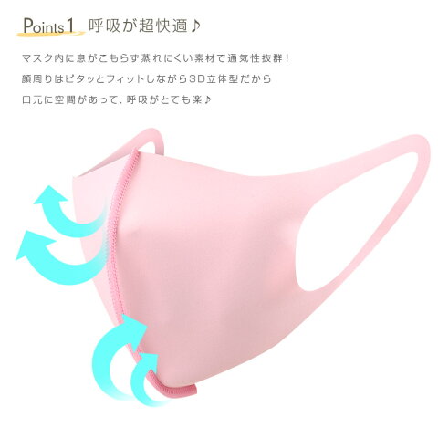 マスク内に息がこもらず蒸れにくい素材で通気性抜群!顔周りはピタッとフィットしながら3D立体型だから口元に空間があって、呼吸がとても楽♪